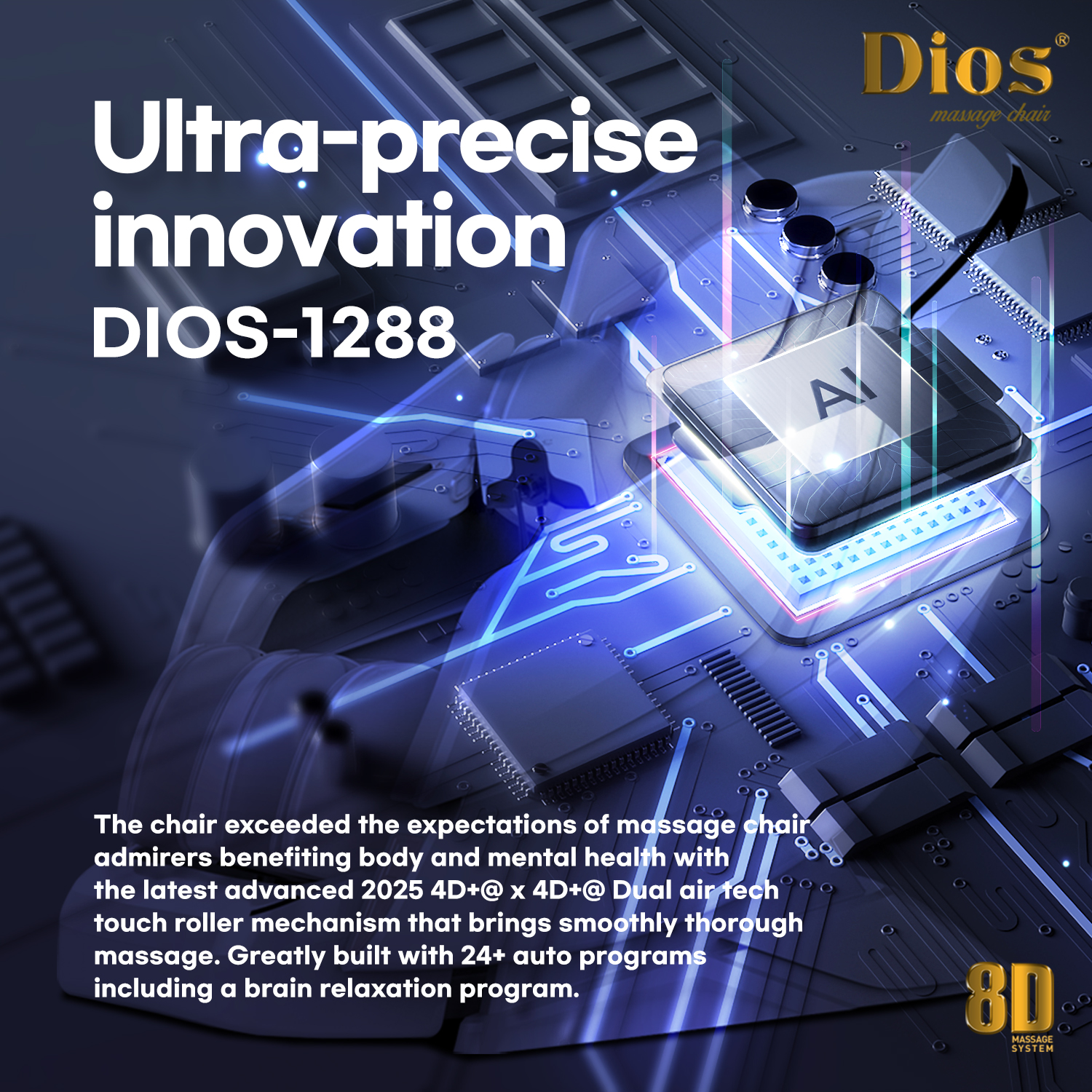 The 8D dual system (4D + 4D) features two independent, professional-grade 4D modules—one for the upper body and one for the lower body—allowing the neck, shoulders, and back to be massaged simultaneously. Each module has independently adjustable intensity, giving you full control over the massage strength for every section of your body. This advanced dual-module design delivers a deep, hand-like massage experience that contours to your body, providing next-level relaxation and tension relief far beyond conventional massage chairs. Enjoy both deep tissue stimulation and gentle, flowing motions, experiencing a spa-quality massage at home like no other.• 24 AI-Powered Automatic Programs