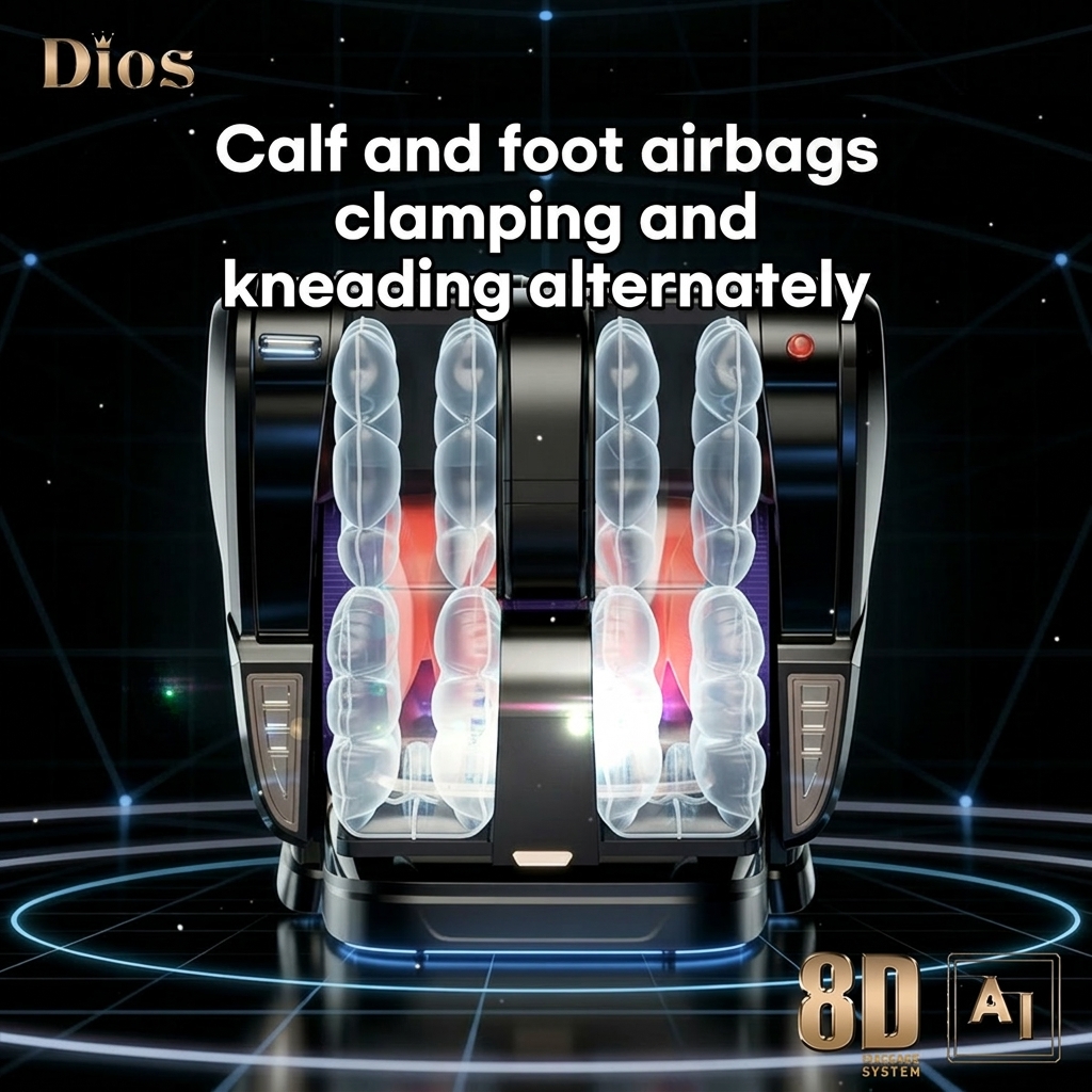 Kneading, tapping, clapping, and Tuina techniques can be delivered individually or together, providing deep muscle stimulation, improved circulation, and targeted tension relief. Enhanced with 24 AI-powered automatic programs, this system offers a smarter, more personalized full-body massage experience.• Advanced 3-Level Calf & Foot Massage — Double-Airbag Hand-Like Therapy